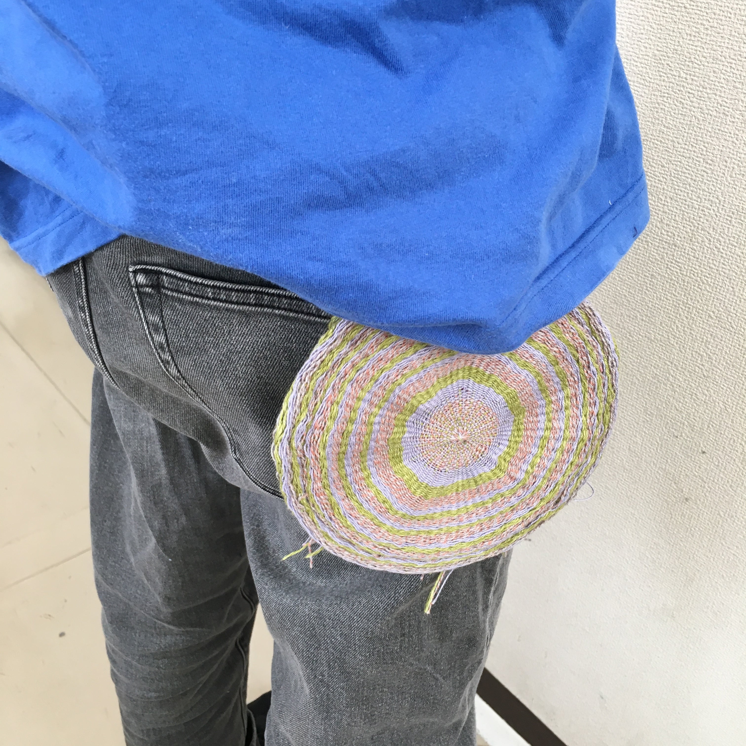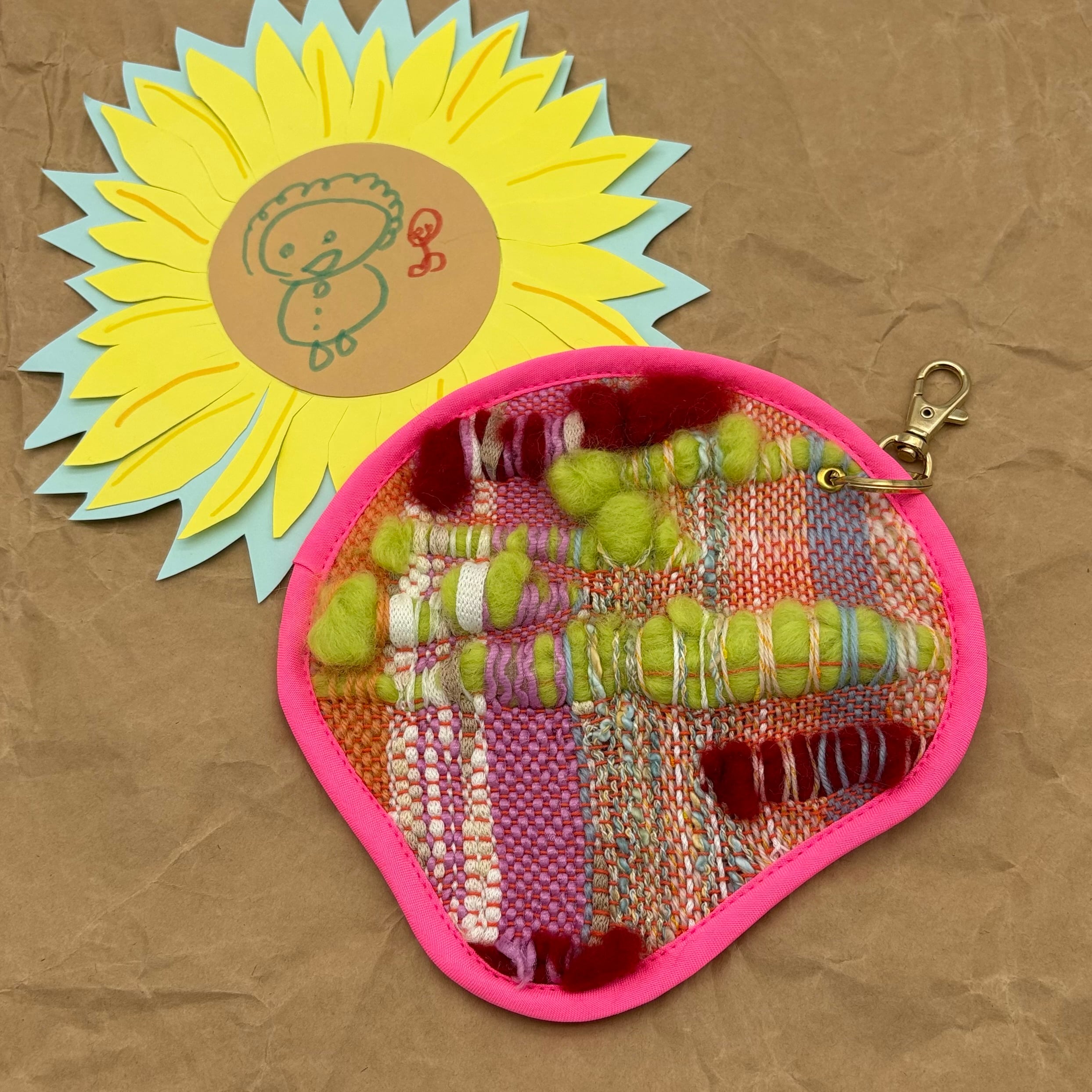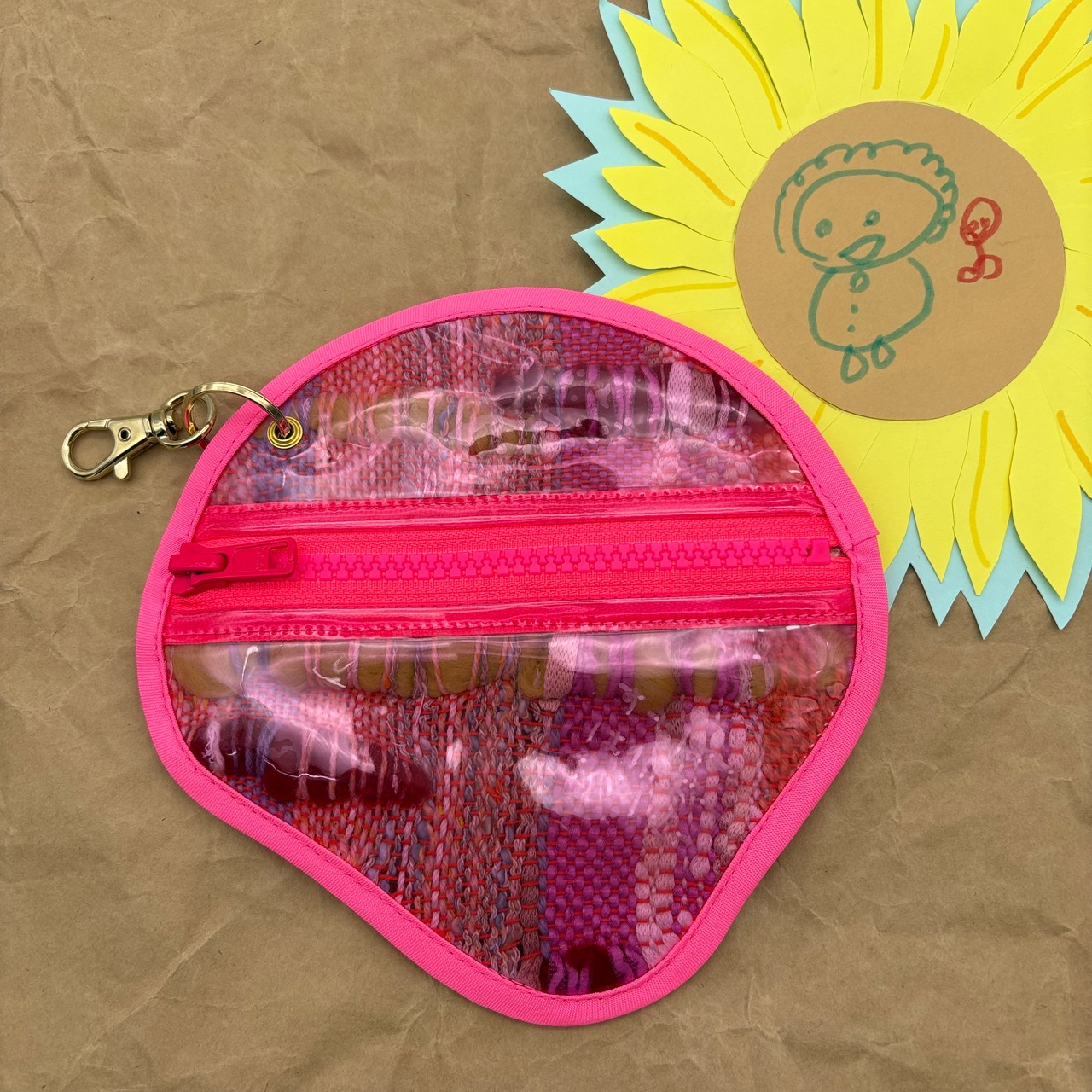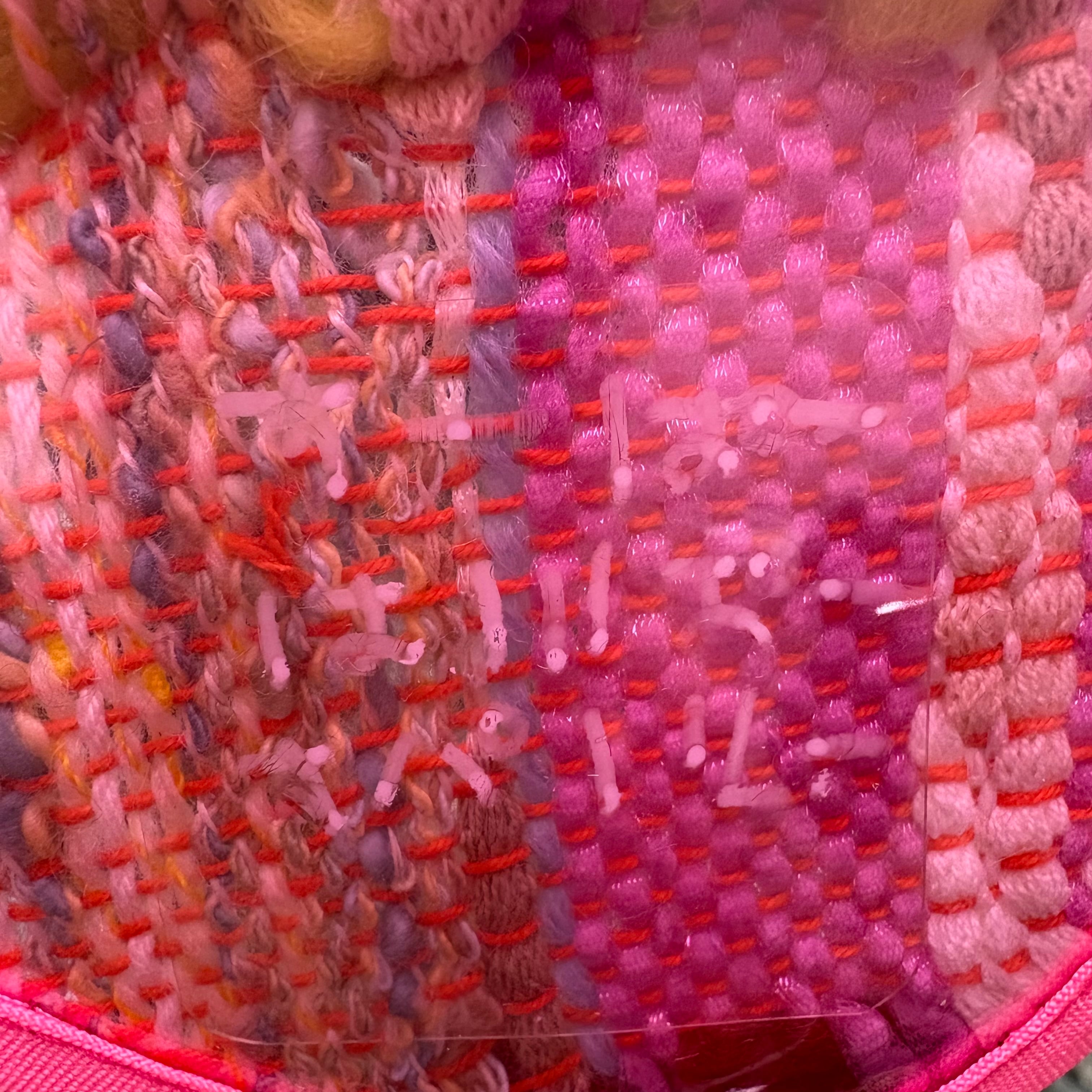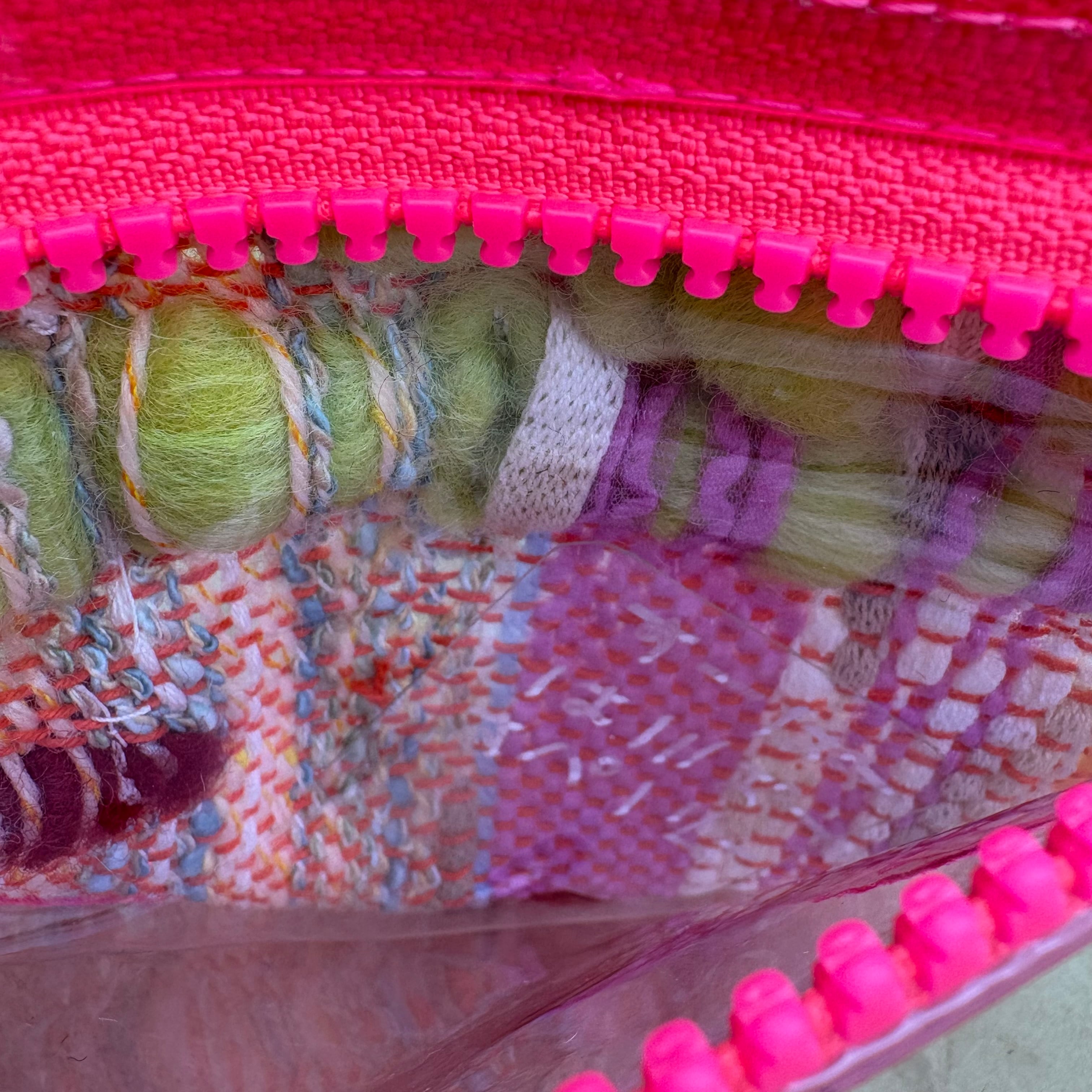 カラー○表面はさまざまな色(羊毛フェルト赤、黄緑、ピンク、オレンジ、水色など)、裏面の内側は透明クリア、外側はピンククリア、ファスナーと縁は蛍光ピンク