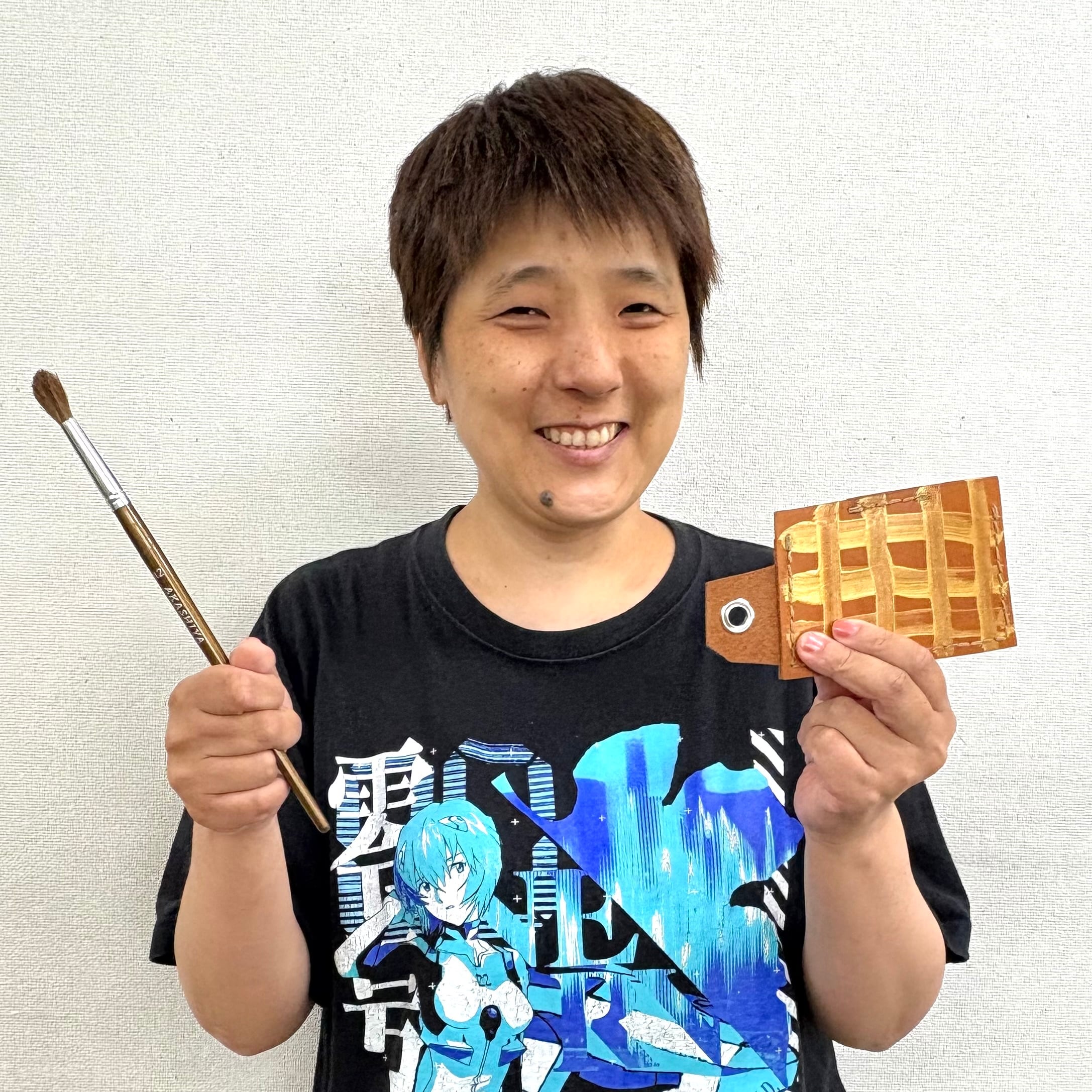 えみさんが布用の画材で革に大胆にペイントされ、