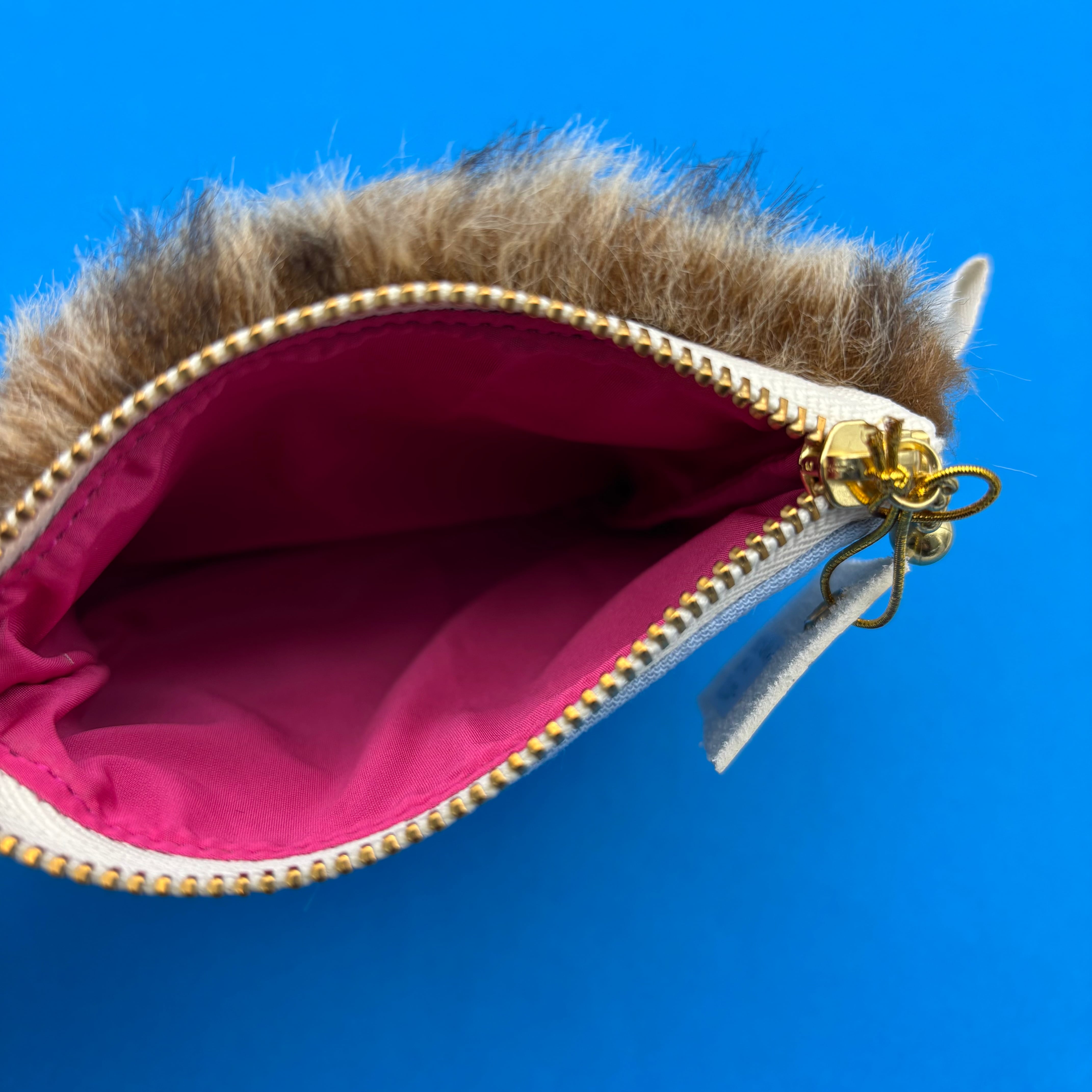 カラー◯表は水色、裏はベージュとブラウン、中はピンク、ファスナーはホワイト
