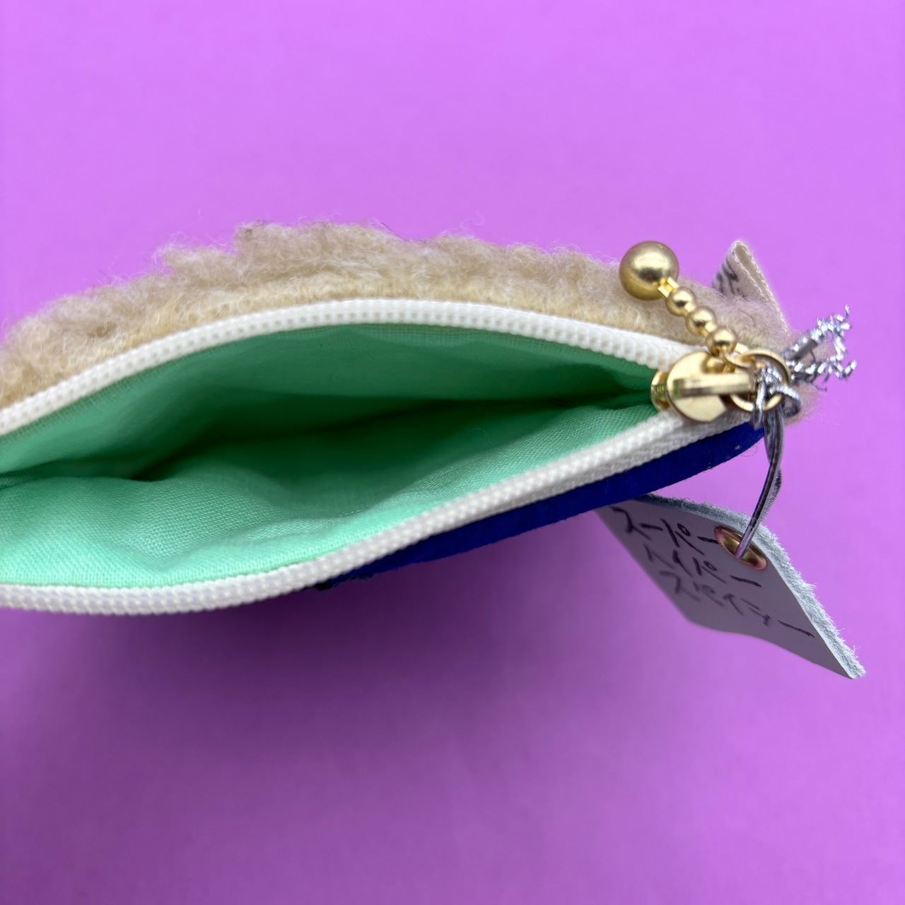 カラー◯表はブルー、裏はベージュ、中はパステルグリーン、ファスナーはホワイト