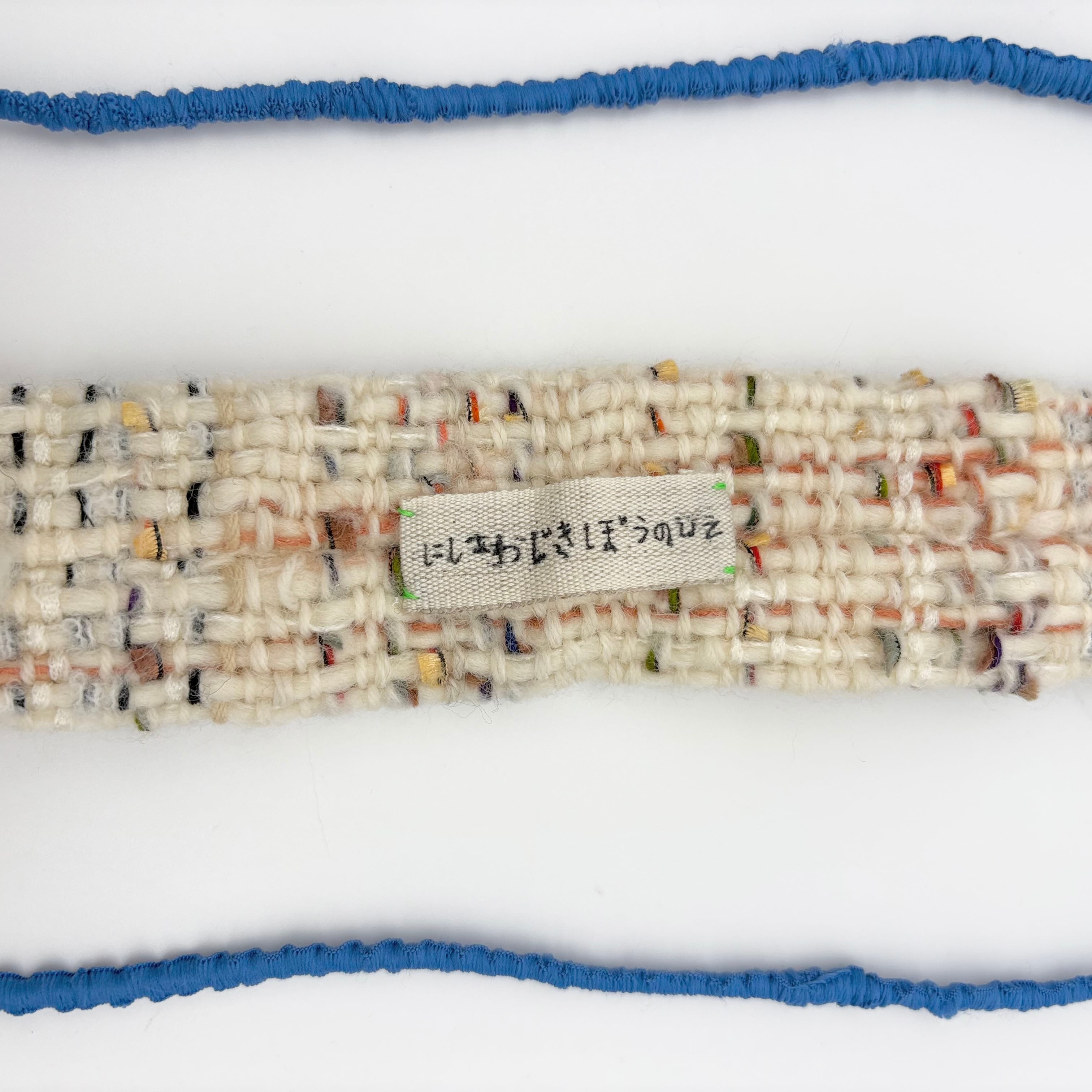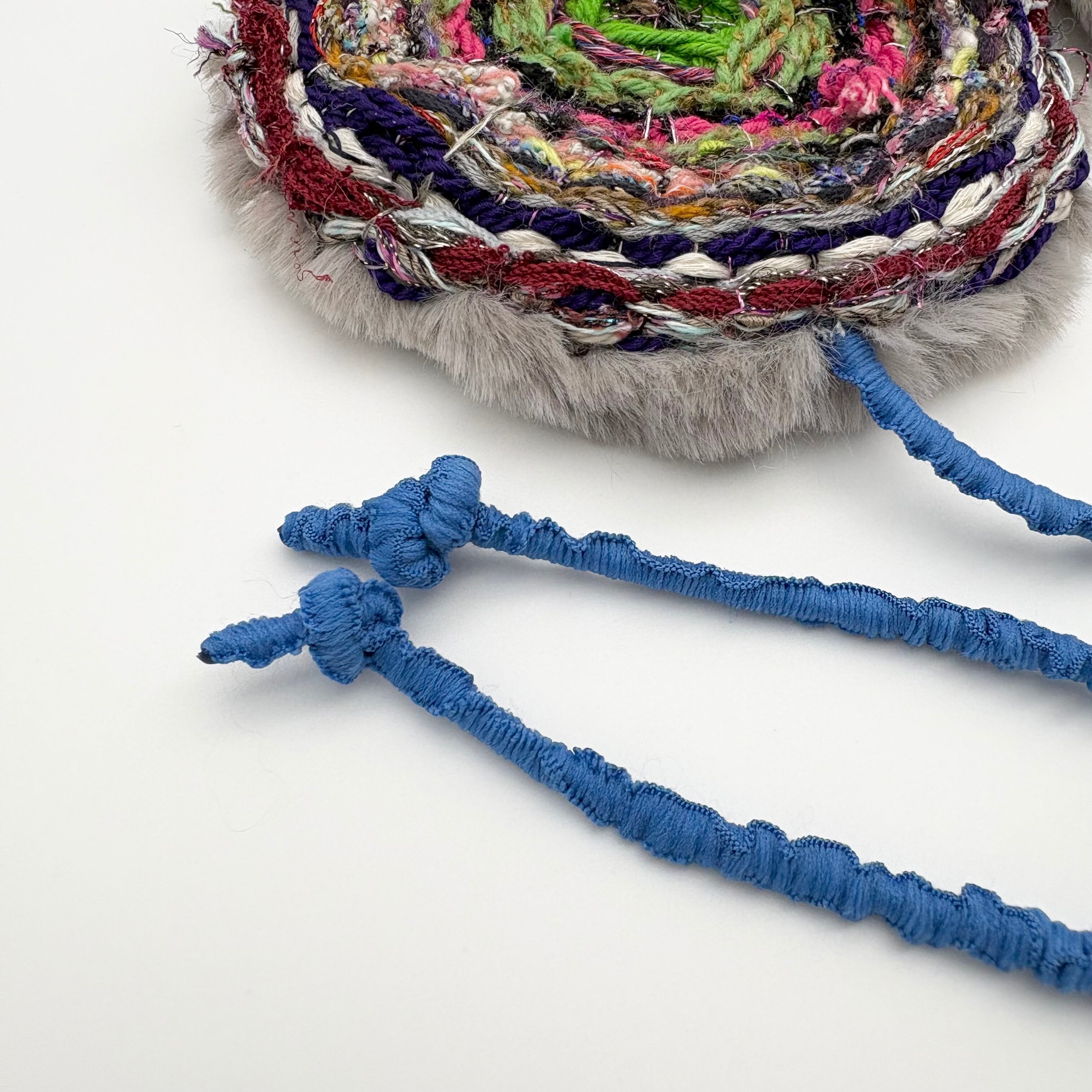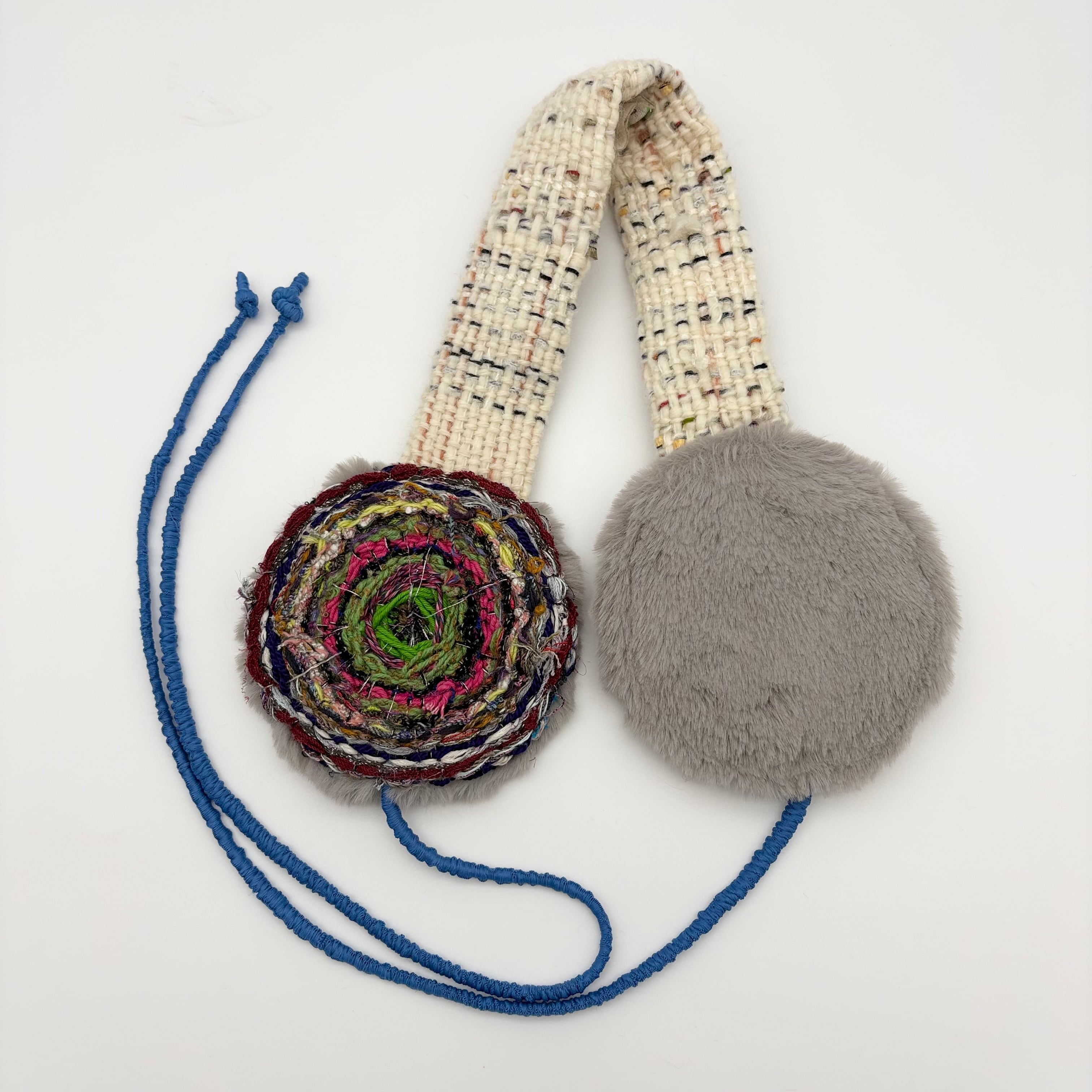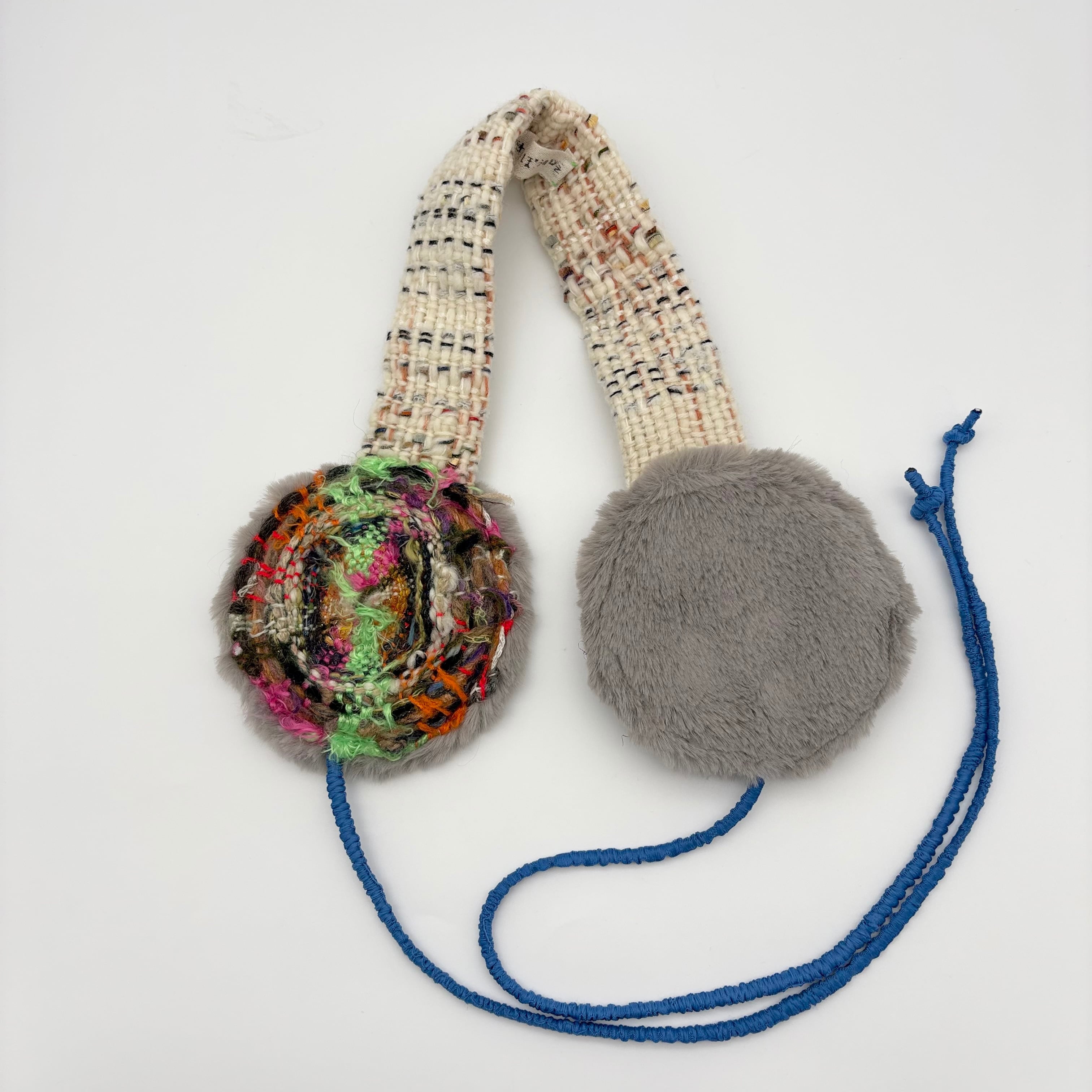 カラー○ 耳に当てる円盤の表は赤、紫、ピンクなどを使ったカラフルな色、裏のファーの色はグレー、頭頂部にあたる織りは白がベースで黒、グレーなども織られています。紐は青色。