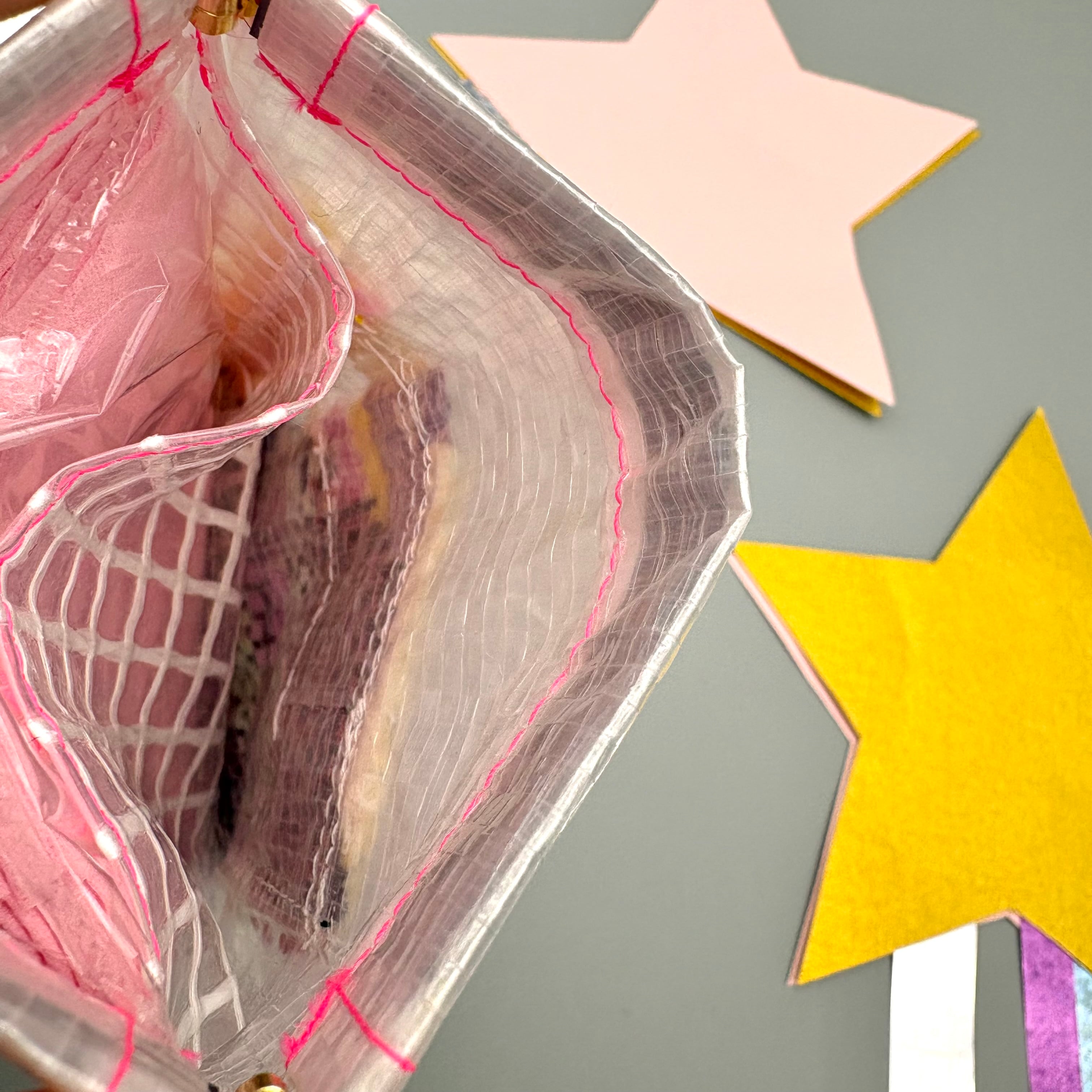 ①糸の色:蛍光ピンク