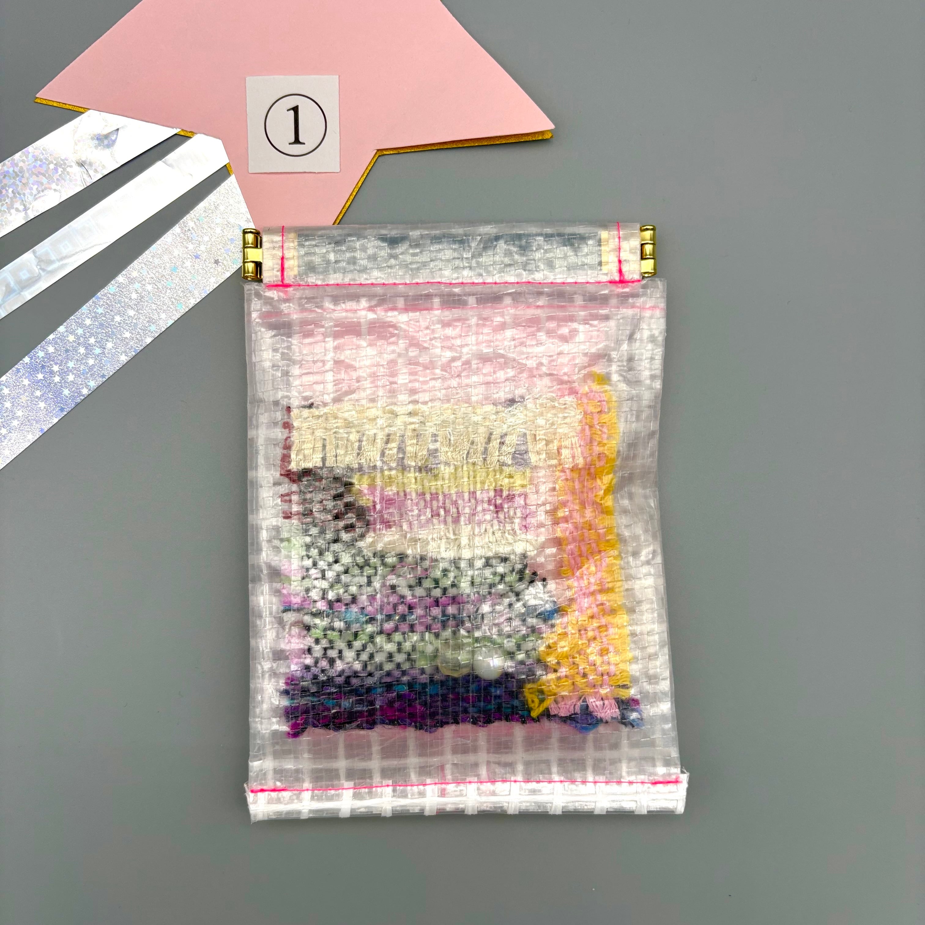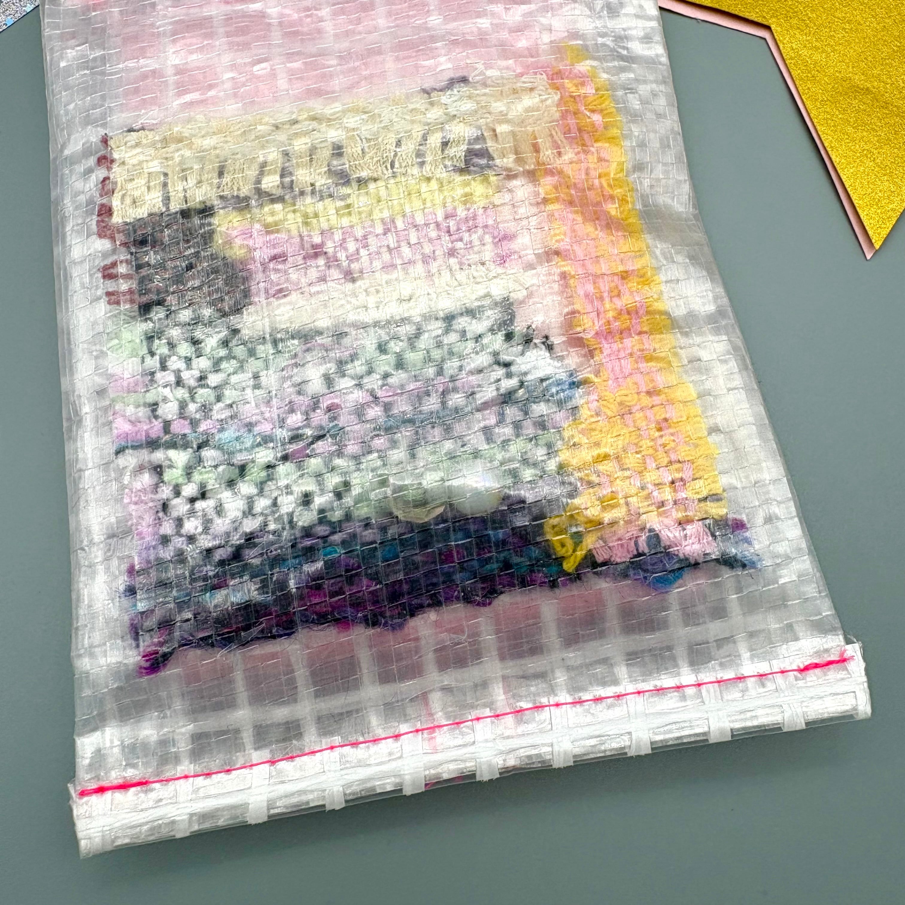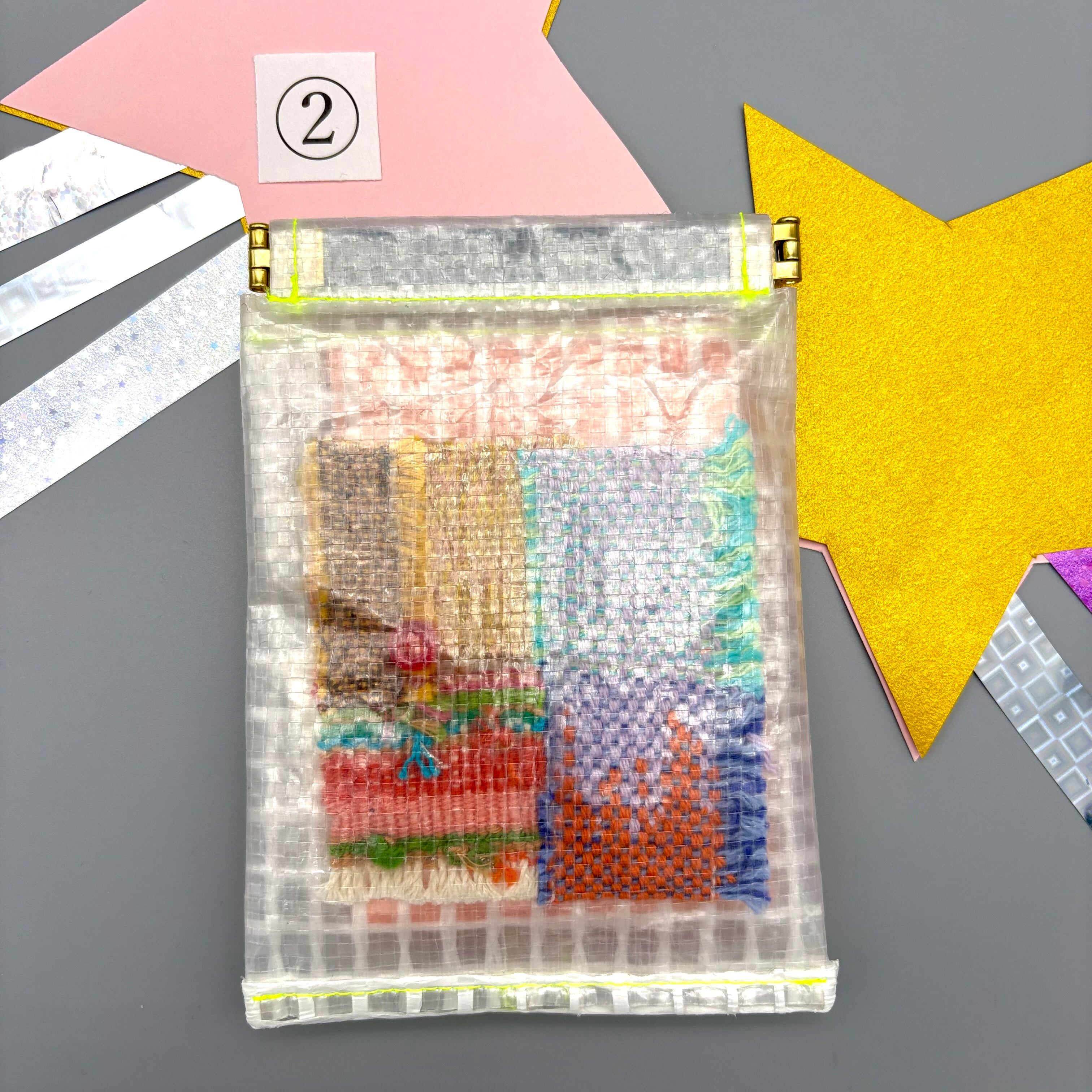 利用者の方が織られた反物の一部分やスパンコールなどのパーツを詰め込んだ、お宝ポーチのティッシュケースバージョンです⭐︎