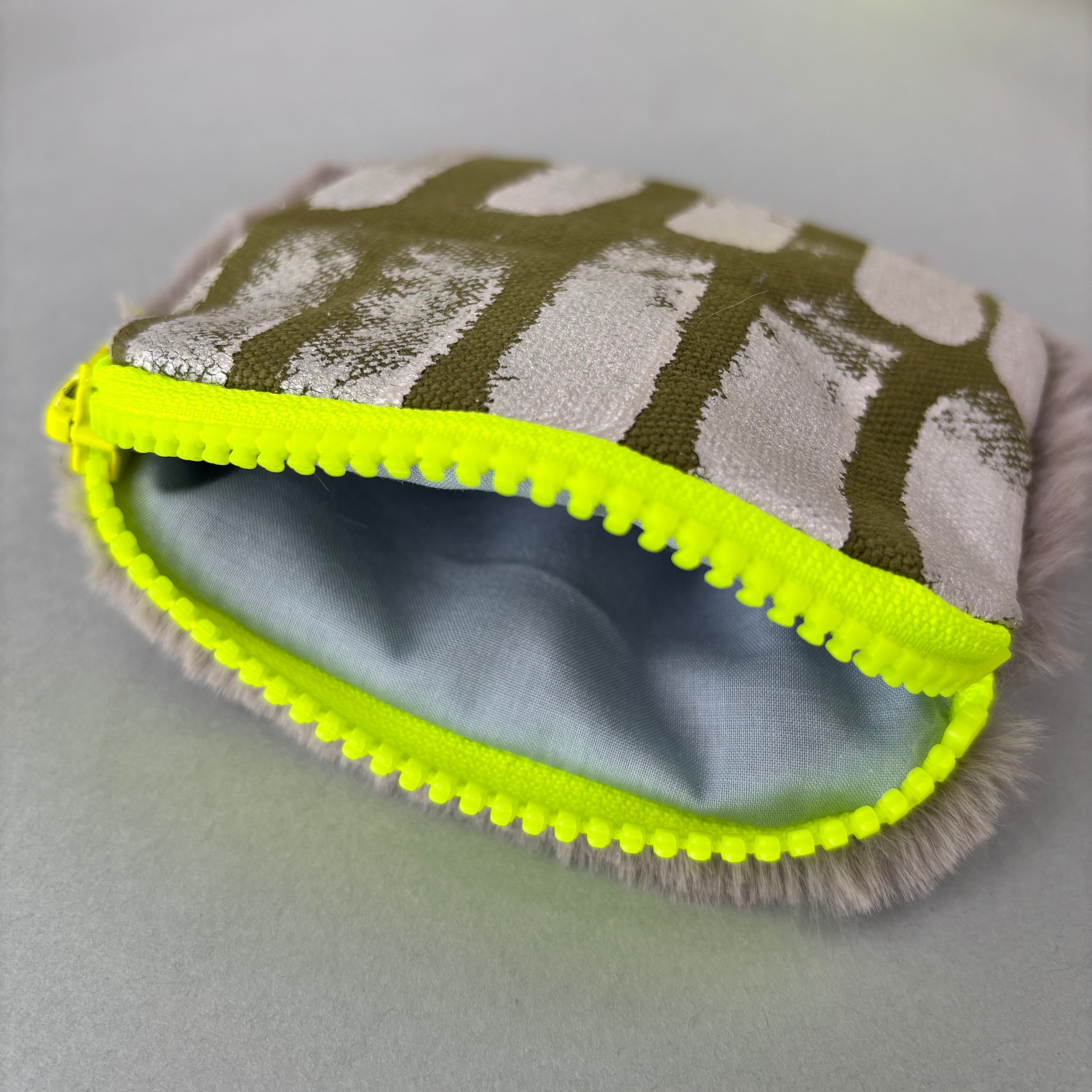 表面はカーキにシルバーでペイント、裏面はグレー、内側はみずいろ、ファスナーは蛍光イエロー