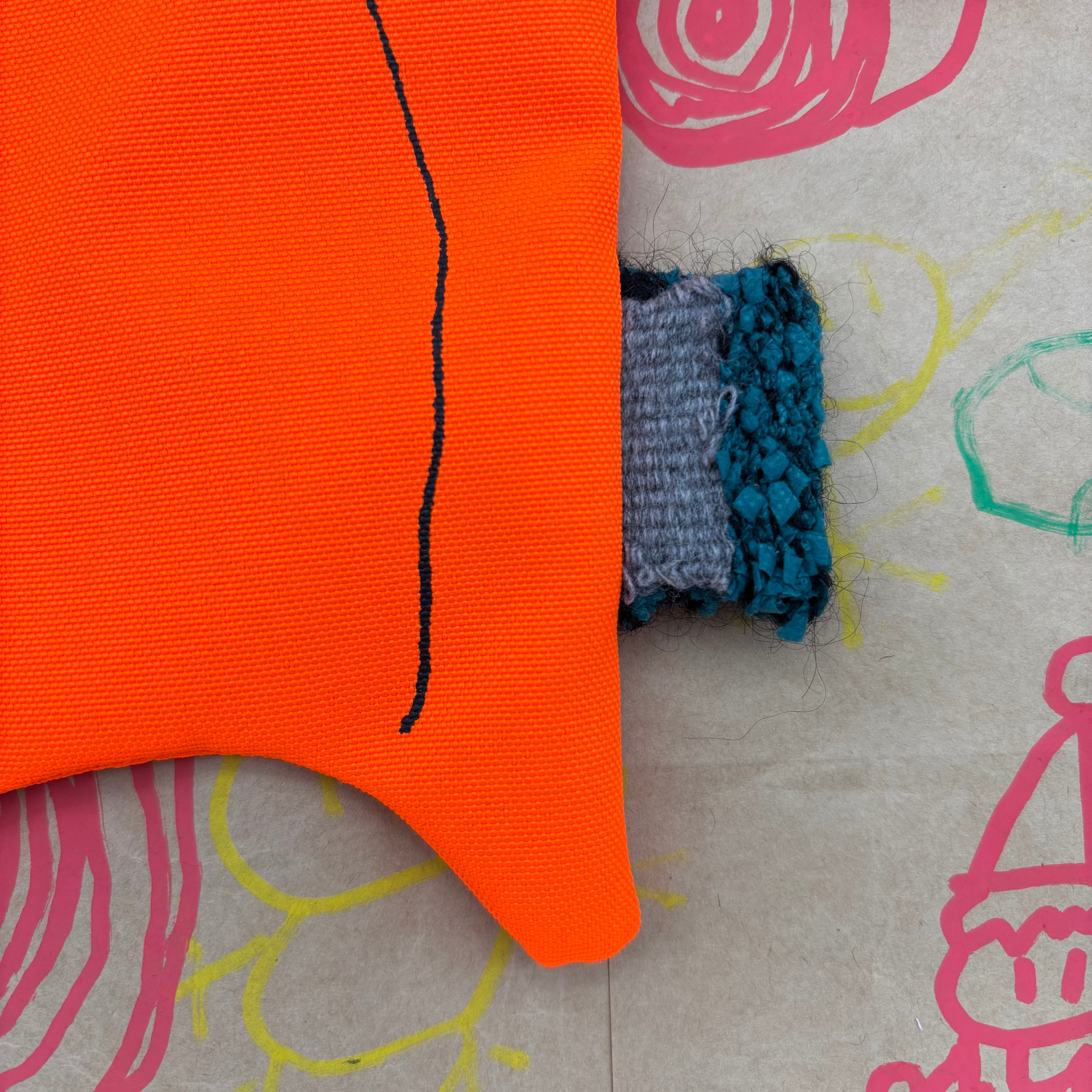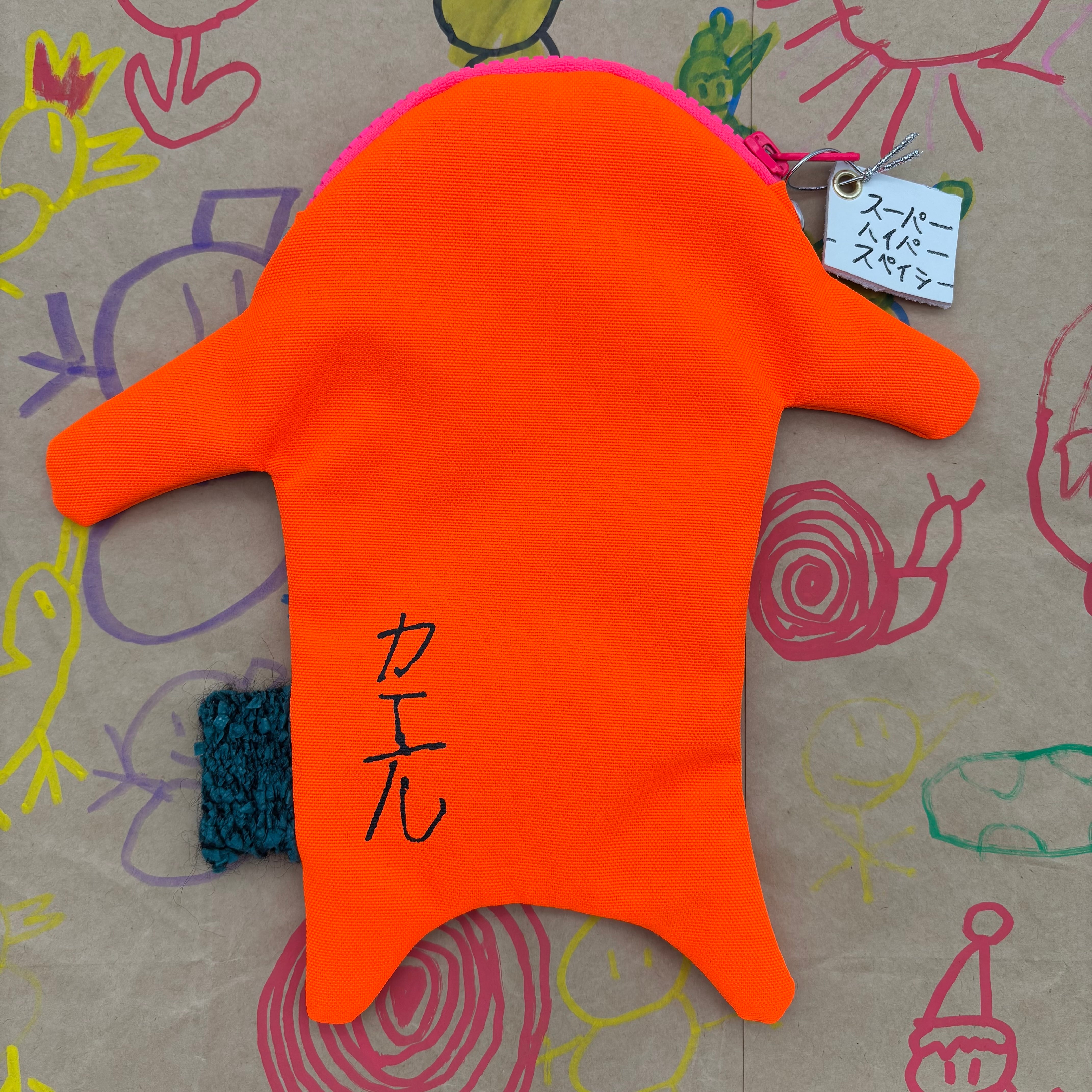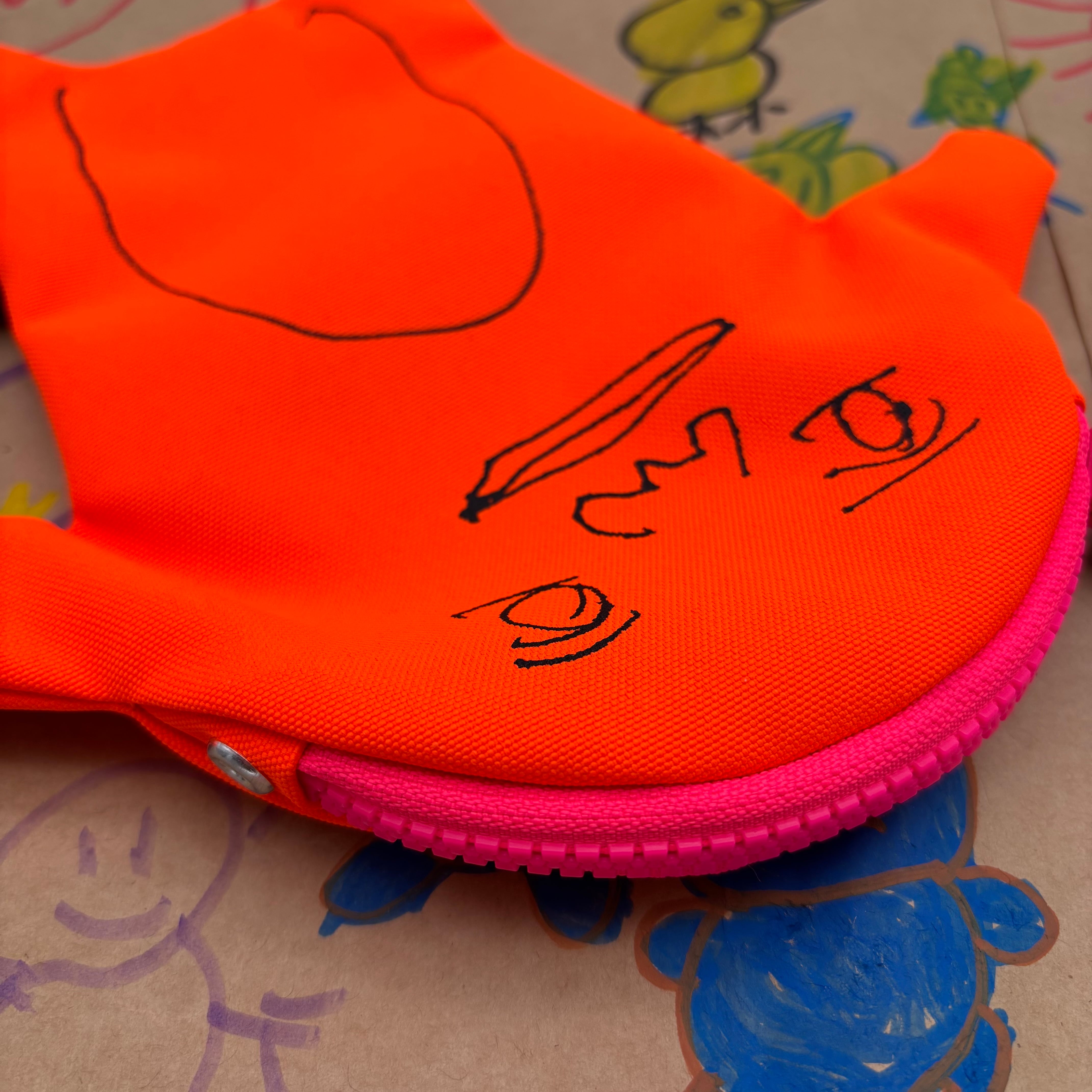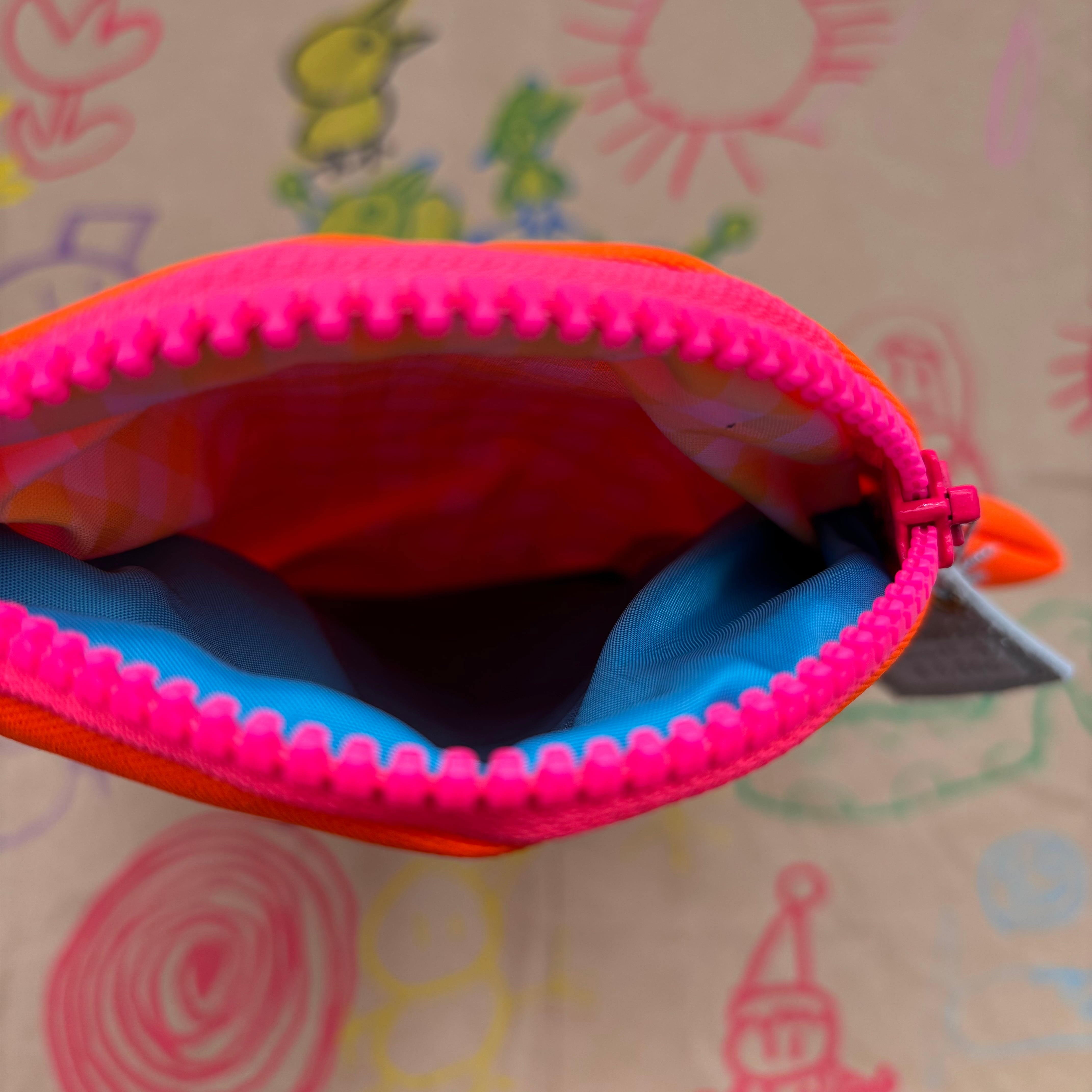 カラー〇蛍光オレンジ、ファスナーは蛍光ピンク、プリントはブラック、裏地は水色と黄色と白チェック
