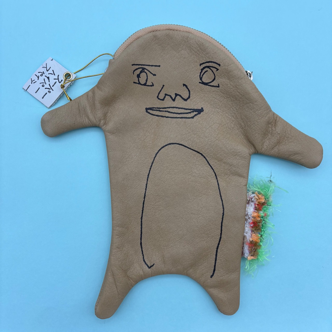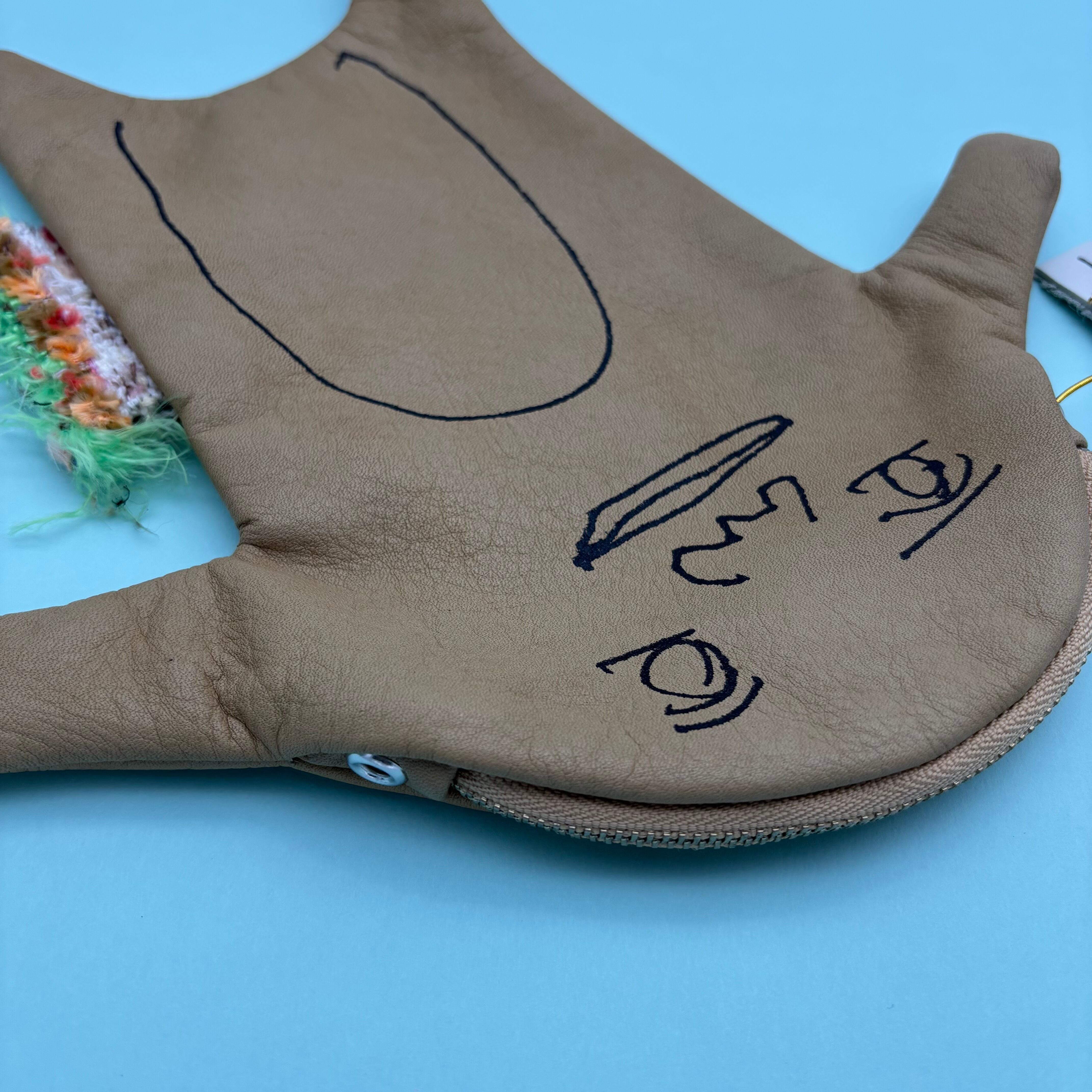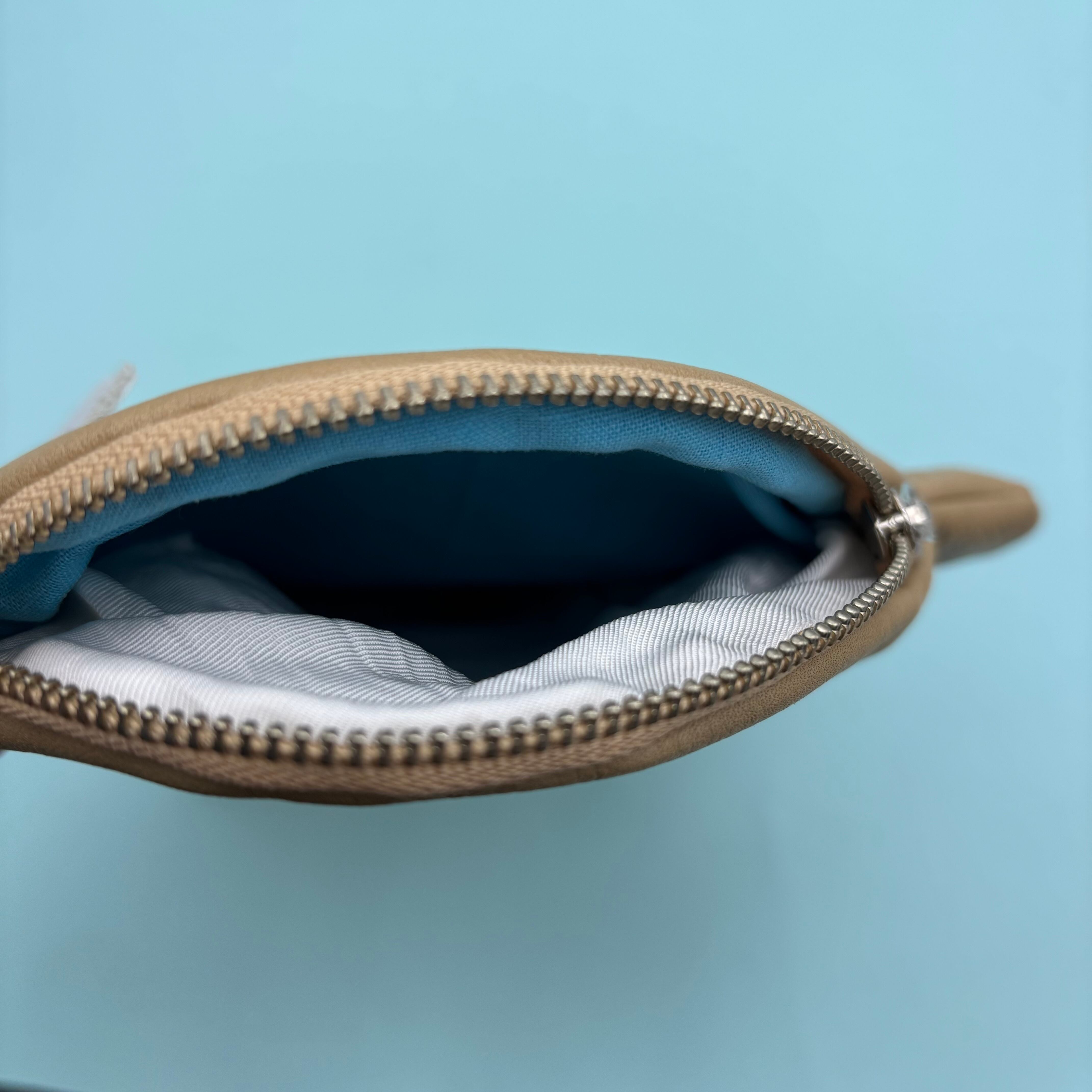 カラー〇ベージュ、ファスナーもベージュ、プリントは黒、裏地は白とパステルブルー